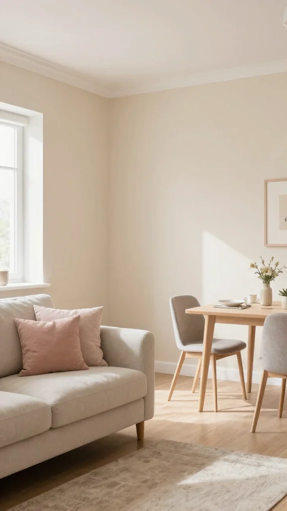 One of the simplest strategies to make your small living room with a dining area feel more open is through color choice. Light shades like soft whites, pastels, or pale grays reflect light, creating a sense of spaciousness. When selecting furniture and decor, opt for lighter tones that harmonize beautifully together.
