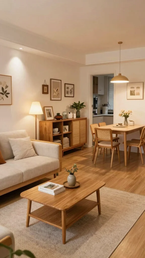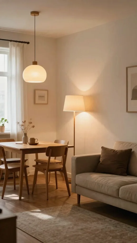 Fun fact: layered lighting can make a small living room with dining area feel up to 20% larger. Mix ambient, task, and accent lighting—pendant lights over the dining table and cozy floor lamps by the sofa work wonders. Dimmer switches let you tailor brightness to mood and time.