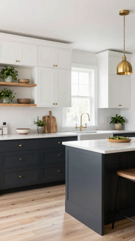 To achieve this look, start with a light countertop that balances the darker tones of the lower cabinets. Incorporating natural wood elements, like a butcher block or cutting board, can infuse warmth and texture, creating a welcoming environment. Pairing open shelving in white allows for an airy feel, preventing the space from feeling heavy or closed in.