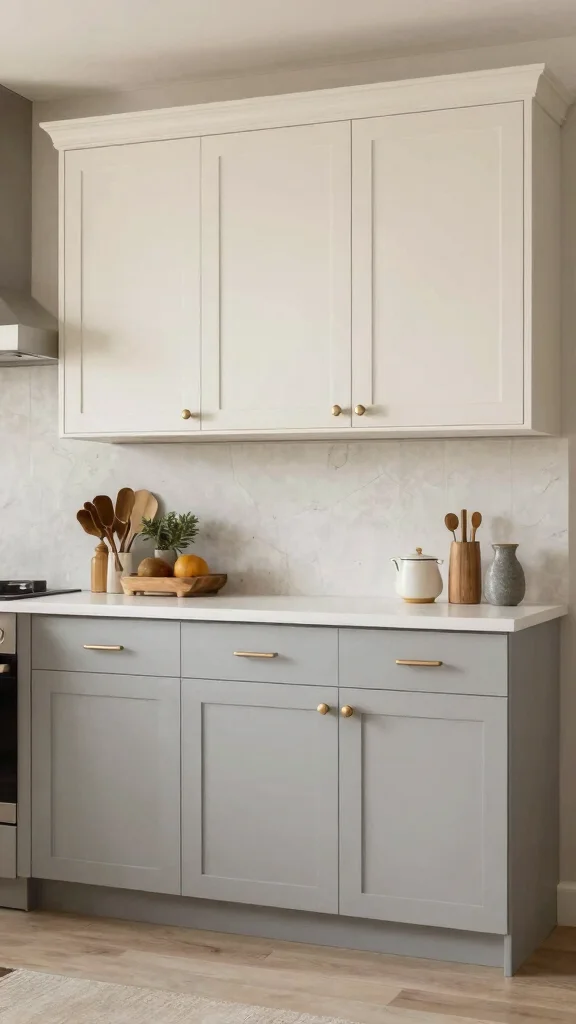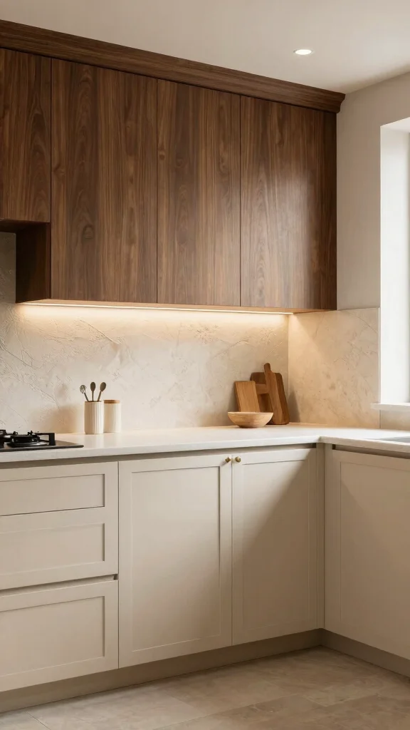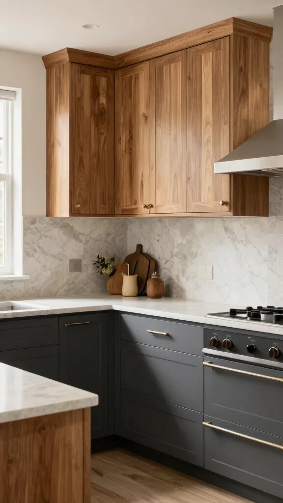 To achieve this look, consider using creamy beige for the lower cabinets to keep the space feeling light. Dark wood for the upper cabinets introduces a touch of richness without overwhelming the kitchen. Pairing this with light-colored countertops ensures that the overall ambiance remains open and inviting.