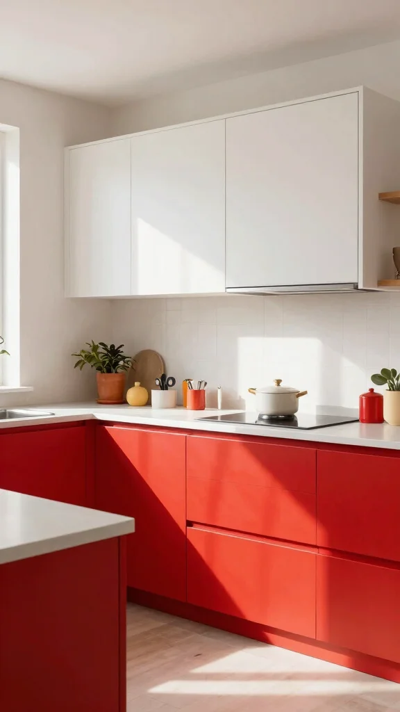 To enhance this vibrant look, consider complementing poppy red with white countertops or a light backsplash that ties the colors together. Incorporating light wood or metallic accents for hardware can maintain a contemporary feel, while playful decor elements add whimsical touches. Balancing the bright red with grounding neutrals in the decor can prevent the space from feeling overwhelming.
