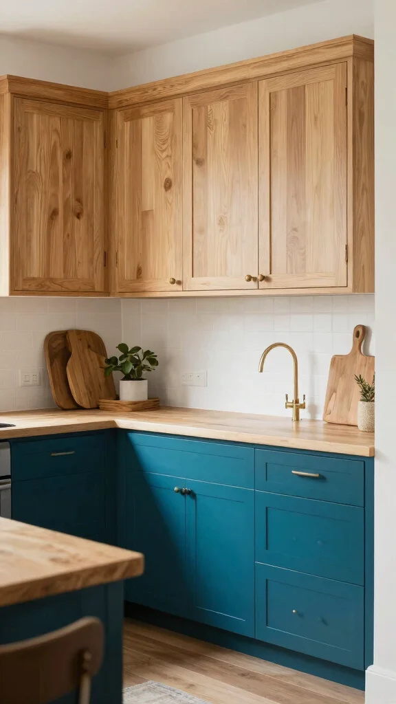 To effectively implement this look, consider utilizing deep teal for lower cabinetry, establishing a strong base. Keeping light maple for the upper cabinets helps lift the overall design, making the space feel open and bright. Pairing this with warm countertop options enhances coziness, tying the elements together beautifully.