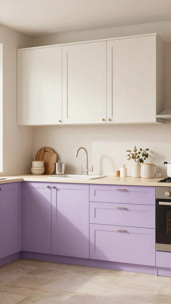 To enhance this aesthetic, consider using soft lavender for lower cabinets to create an inviting foundation. Keeping creamy whites for the upper cabinets maintains a light and open feel throughout the kitchen. Incorporating gold or silver accents elevates the overall look, adding a hint of sophistication.