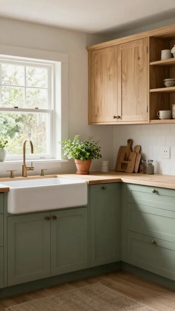 To enhance this look, consider pairing sage green with white or light gray countertops for a clean and crisp appearance. Adding woven baskets or wooden decor pieces can introduce additional texture, making the kitchen feel more layered and cozy. This color combination works well with rustic farmhouse styles, allowing for easy integration of vintage finds and charming accents.