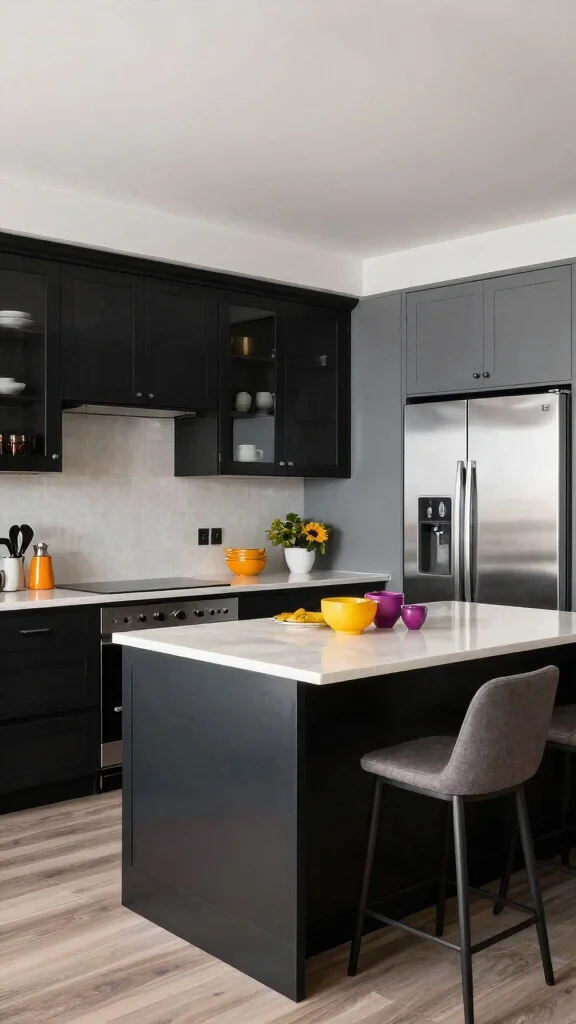 For those who appreciate drama, the combination of bold black and soft gray creates a striking visual contrast that commands attention. This pairing is sleek and modern, making it an excellent choice for contemporary kitchens. The boldness of black cabinets provides a strong foundation, while soft gray elements lighten the space, creating balance. Accentuating this look with glass cabinet doors adds depth and intrigue.