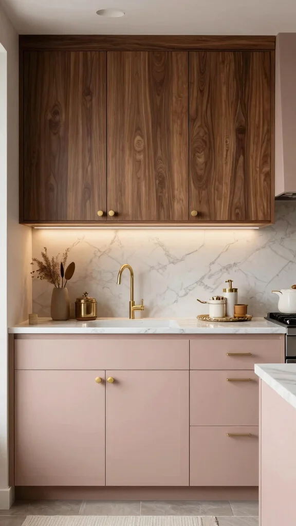 To elevate this look, consider pairing muted blush cabinets with luxurious marble countertops. Warm lighting can enhance the romantic atmosphere, making the kitchen feel inviting. Adding gold accents can also elevate the design, creating a refined and elegant feel throughout the space.