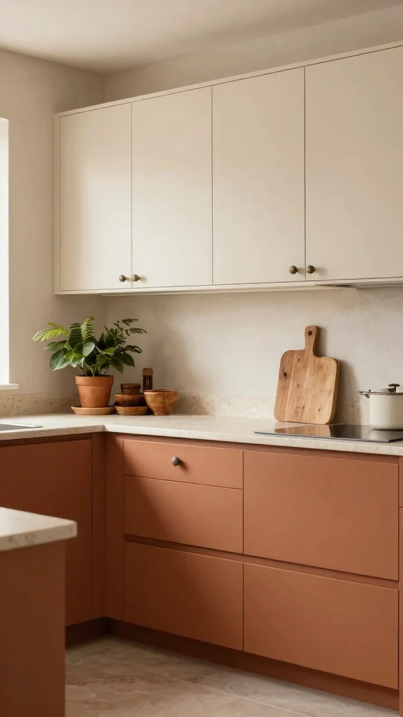 Terracotta paired with pale cream evokes a warm and inviting environment, creating a grounded and organic feel in your kitchen. This combination works exceptionally well with rustic design elements, reflecting a connection to nature. The earthy tones of terracotta can anchor the space, while the pale cream keeps the atmosphere light and airy, making the kitchen feel expansive.