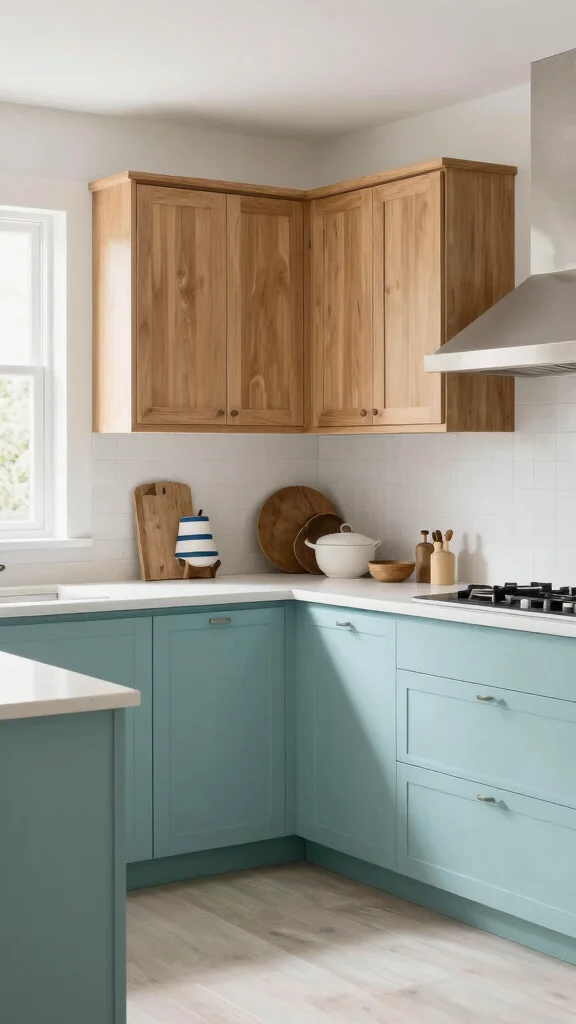 Soft aqua cabinets combined with natural wood create a refreshing coastal vibe, perfect for bringing serenity into your kitchen. This combination feels inviting and light, making it ideal for those who love a relaxed aesthetic. The gentle aqua tones evoke feelings of tranquility, while the natural wood elements ground the design, creating a harmonious balance.