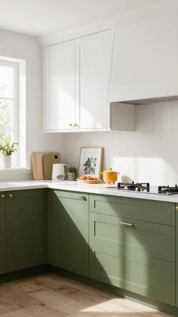 Opting for olive green cabinets paired with bright white creates a chic and refreshing look in your kitchen. This trendy combination invokes a sense of calm while making a stylish statement. The rich olive tones bring depth, while the bright white elements help keep the space open and airy, creating a balanced environment that feels both inviting and sophisticated.